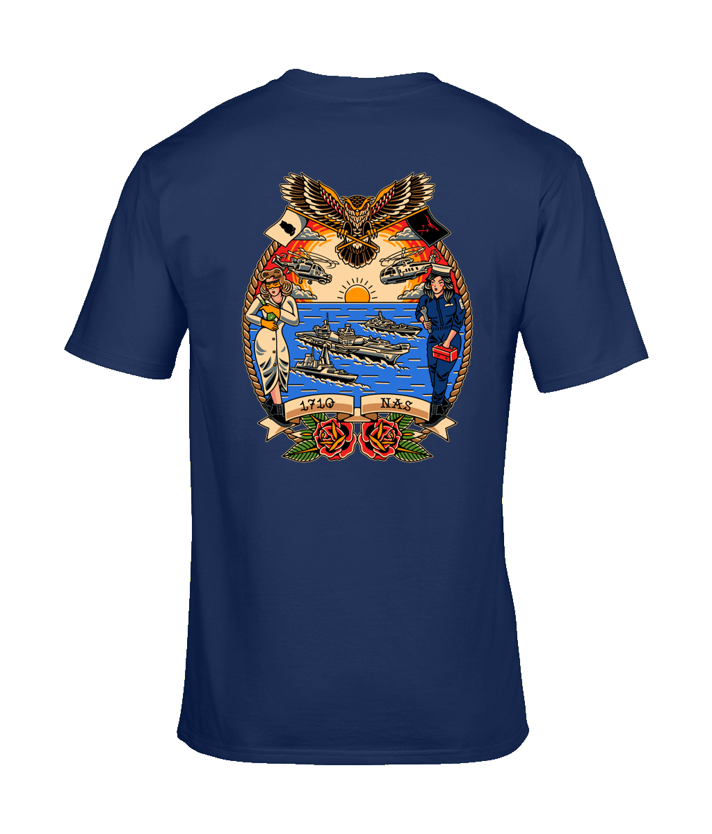 Celebrate the legacy of the 1710 Naval Air Squadron with this heavy cotton t-shirt designed by The Chits Inn. Available in white, black, navy blue, military green, and grey, it features a stunning design that includes the squad...