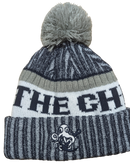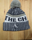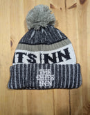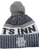This cozy winter beanie features a stylish tri-color design in black, gray, and white with a prominent "THE CHITS INN" text across the front. The knit construction showcases ribbed detailing at the cuff and a heathered pattern in the upper portion, topped with a plush gray pom-pom for added flair.