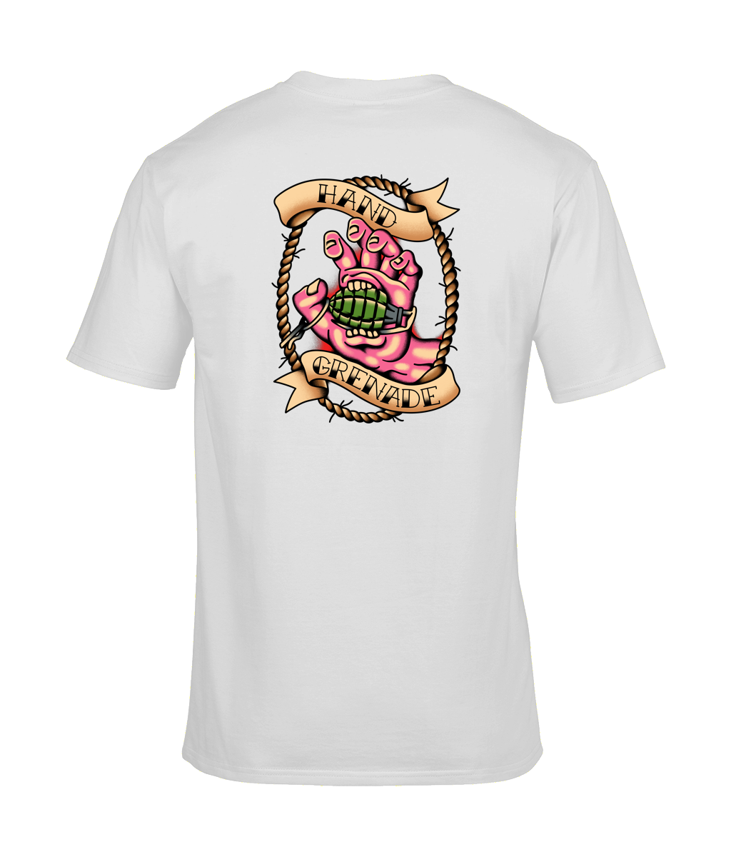 Cause a Stir in Traditional Naval StyleMake waves in your mess or on your run ashore with The Chits Inn's exclusive Hand Grenade Tee! This bold design features a striking blue hand clutching a classic green grenade, framed by a...