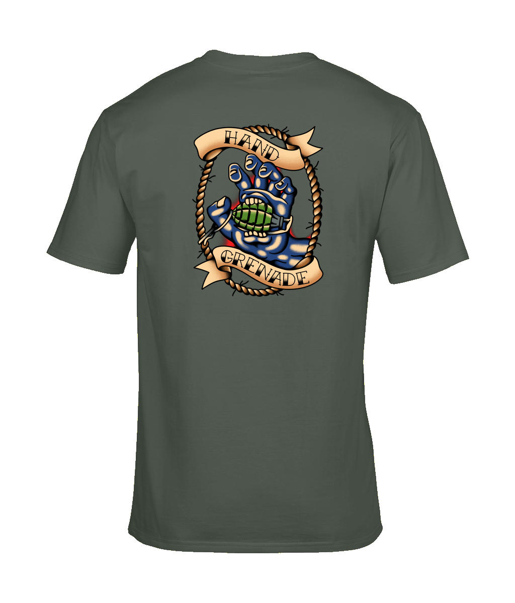 Cause a Stir in Traditional Naval StyleMake waves in your mess or on your run ashore with The Chits Inn's exclusive Hand Grenade Tee! This bold design features a striking blue hand clutching a classic green grenade, framed by a...